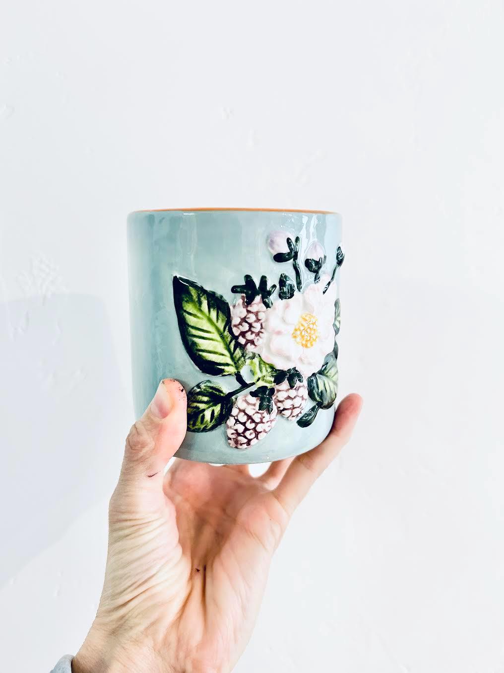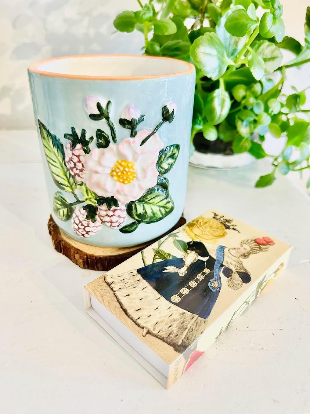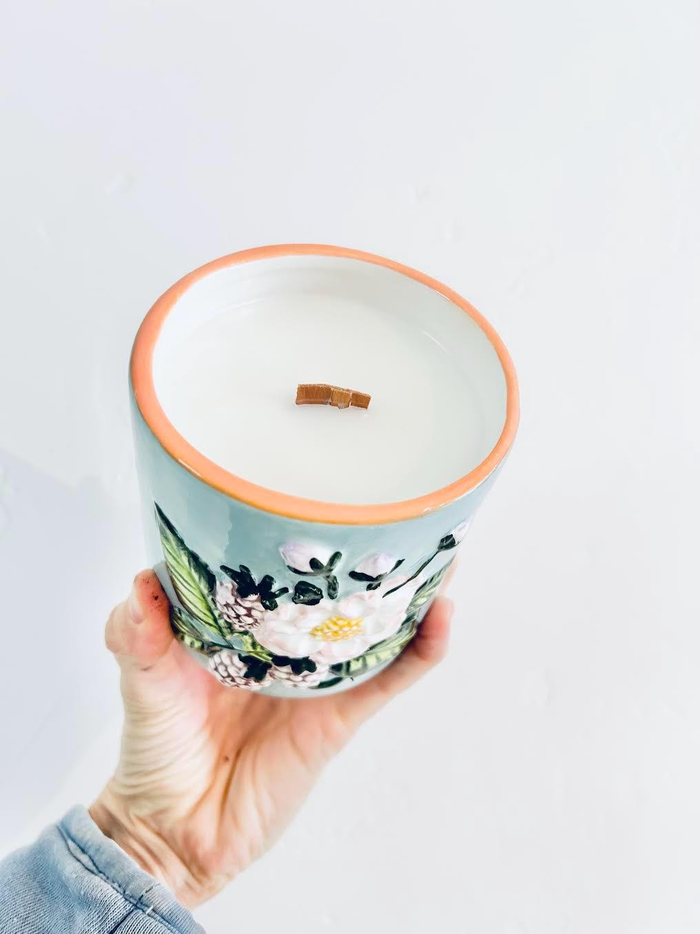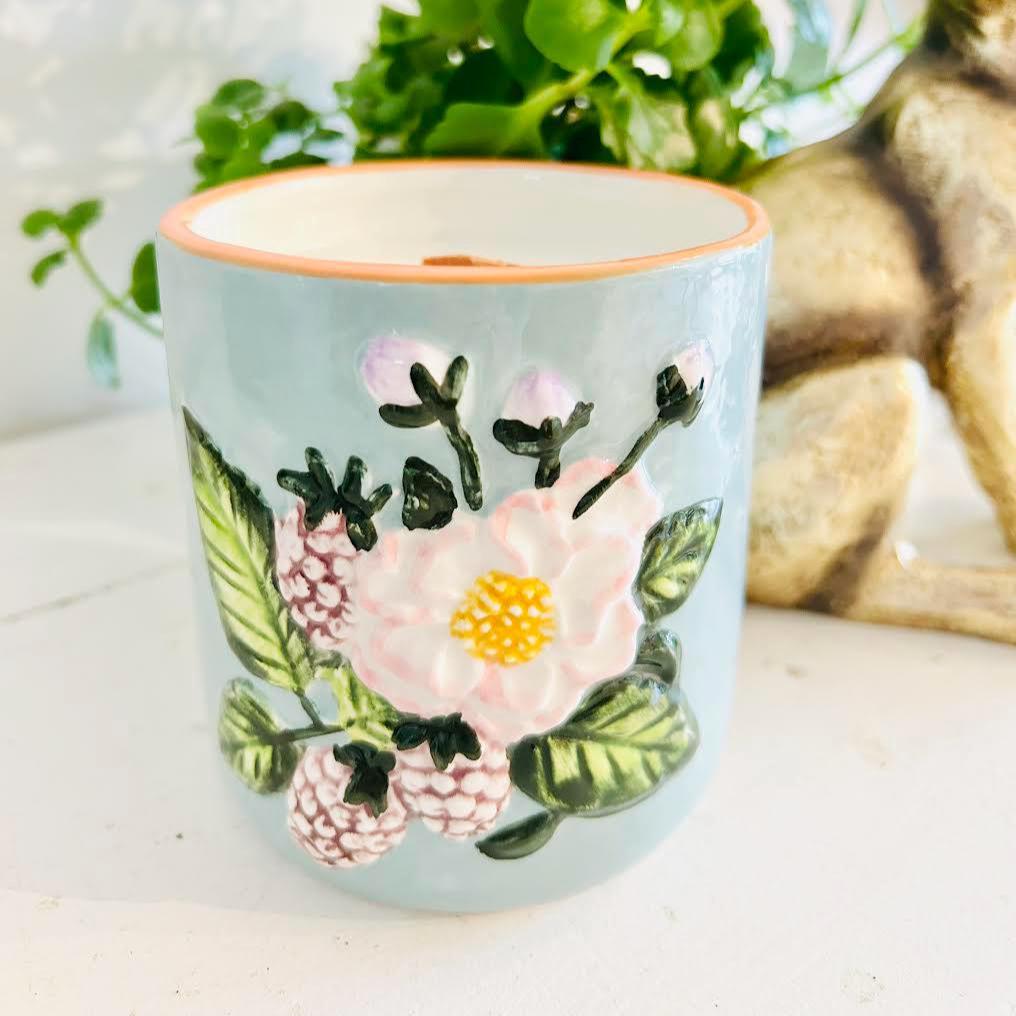 Lovely, Ceramic Mother's Day Floral Candle. Large, 16oz, long burning with wood wick. Raised floral and berry pattern. Makes lovely flower pot once finished with candle!